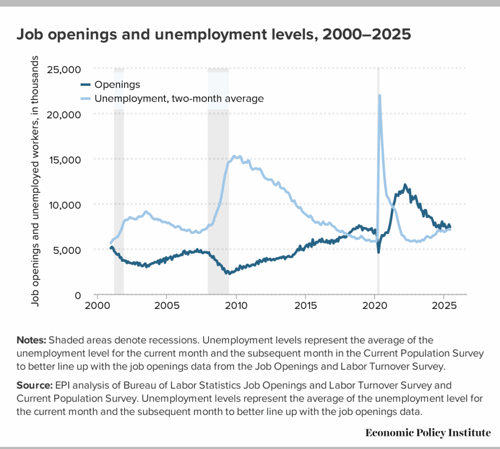 Not stellar—but not catastrophic either. And here’s a figure I watch even closer: 7.4 million job openings (June 2025), up 25,000 from a year ago. That means businesses are hiring—but can’t find enough qualified or available workers.